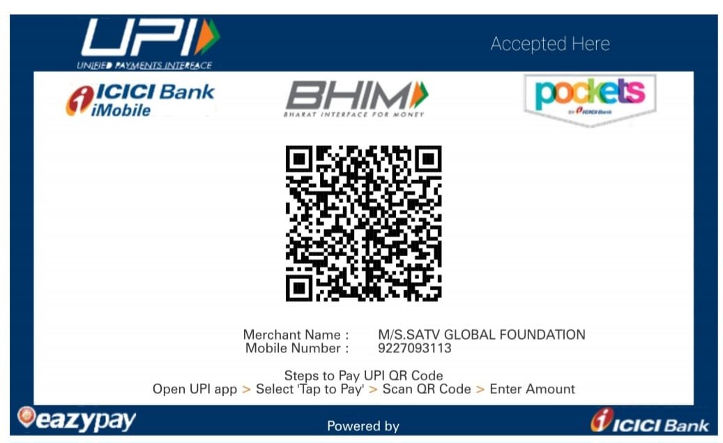 Name : SATV Global Foundation AC no : 183305001165 IFSC code : ICIC0001833